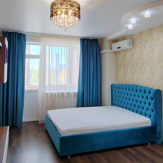 2 лифта, 2 входа в подъезд. Кухня совмещённая с гостиной 30 кв. М. + 2 спальни с окнами на разные стороны. На полу ламинированный паркет, в каждой спальне кондинционер, 2 спальная кровать и шкаф. На кухне, совмещённой с гостиной стоит большой диван, новый холодильник, кухонный гарнитур, новая печь Свч, духовка, посуда.