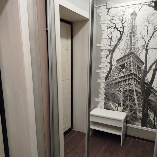 В квартире вместительная гардеробная и шкаф-купе для хранения вещей.