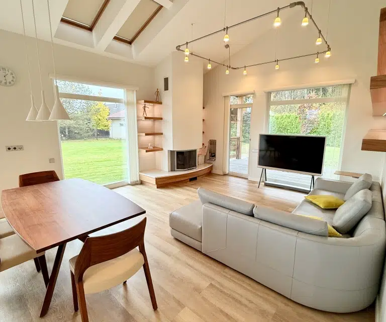 • Комфорт: умная вентиляция с рекуперацией, теплые полы, высокие потолки: 4 метра на первом этаже, 3 метра на втором