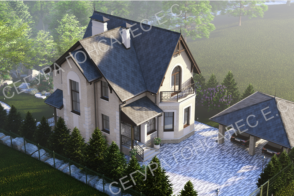 • Площадь — от 270 м² вместе с террасами и навесом для автомобилей;