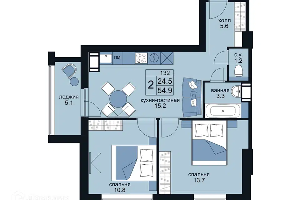 2-комн. кв., 54.9 м², 9/15 этаж