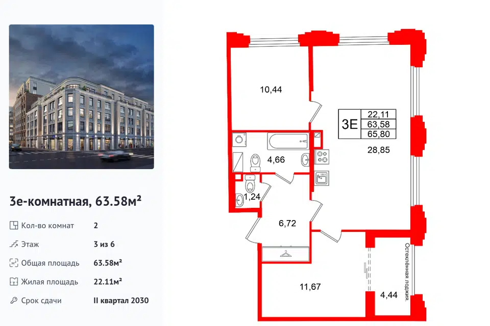 2-комн. кв., 63.58 м², 3/1 этаж