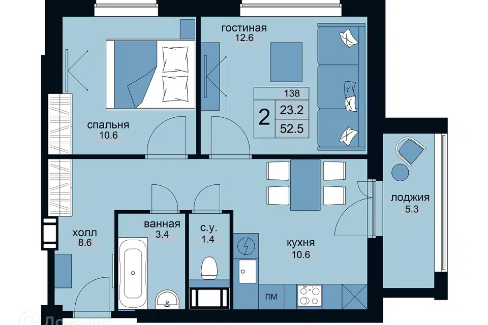 2-комн. кв., 52.5 м², 9/15 этаж