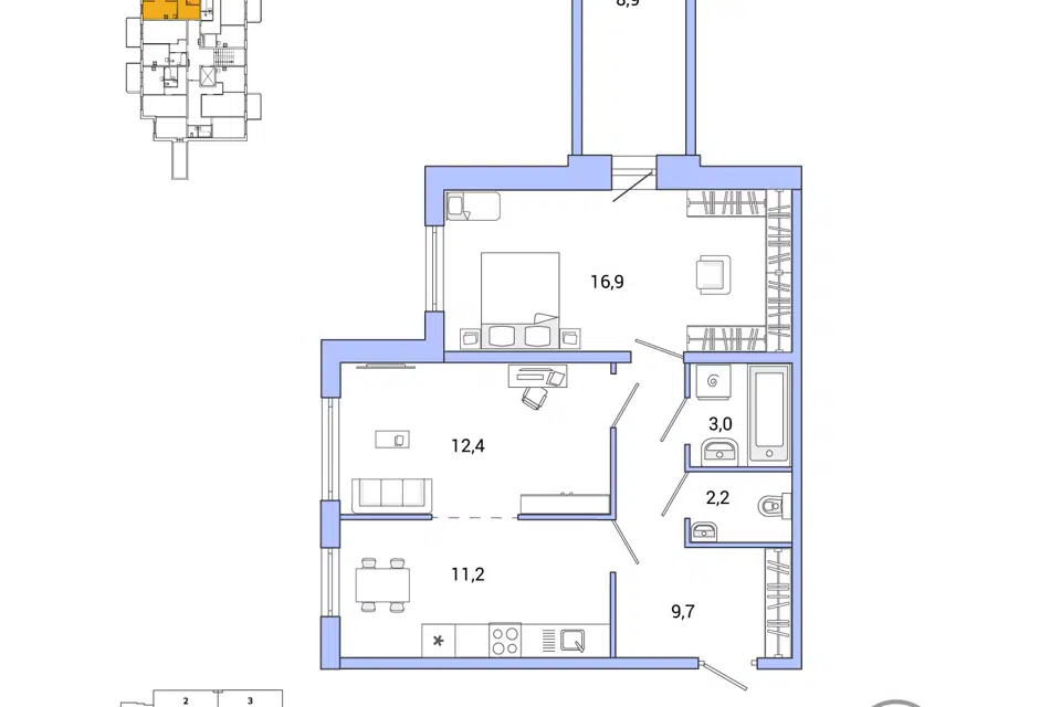 2-комн. кв., 52.8 м², 8/9 этаж