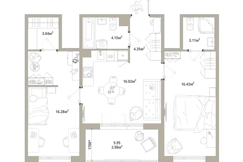 2-комн. кв., 59 м², 2/16 этаж