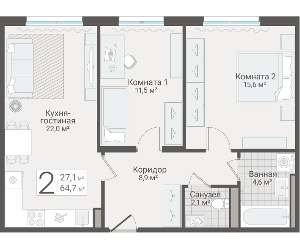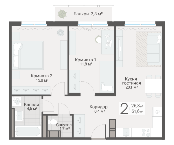 2-комн. кв., от 61.5 м², 1-10 этажи