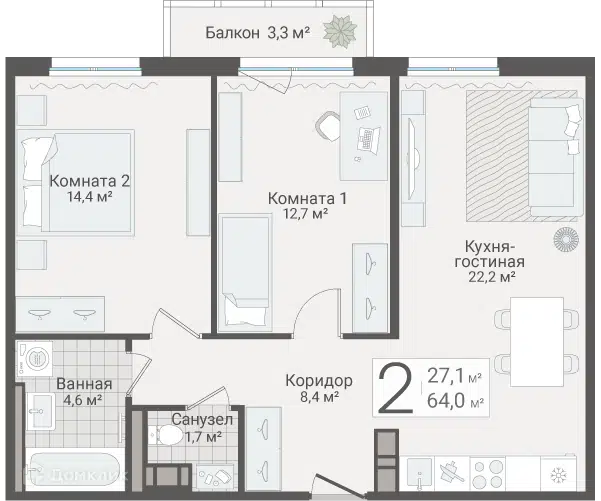 2-комн. кв., 61.9 м², 7/8 этаж