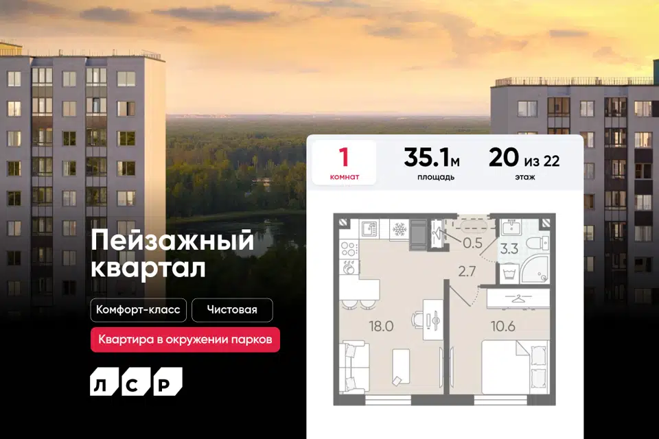 1-комн. кв., 35.1 м², 9/22 этаж
