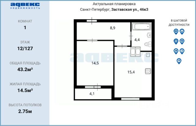 1-комн. кв., 43.2 м², 12/127 этаж