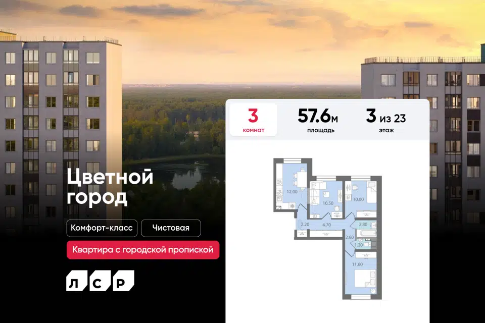 3-комн. кв., 57.6 м², 3/25 этаж