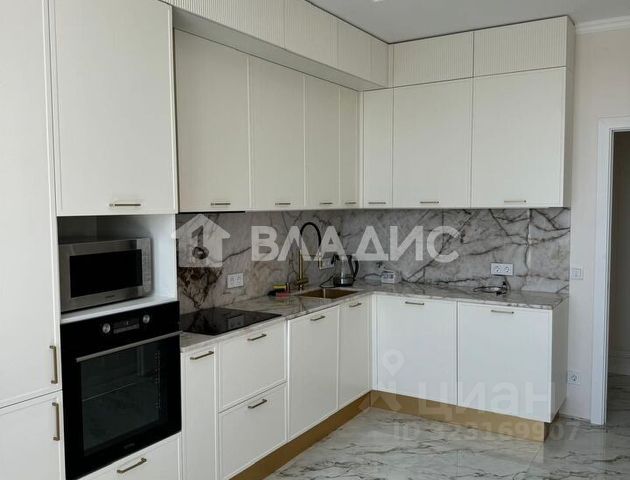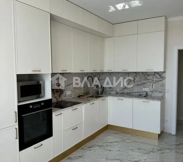 Кухонный гарнитур с варочной поверхностью и вытяжкой, а также встроенная мебель в ванной комнате остаются новому владельцу.