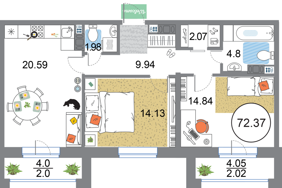 2-комн. кв., 72.37 м², 12/13 этаж