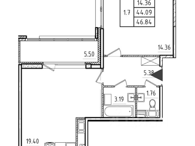 1-комн. кв., 43.6 м², 2/9 этаж