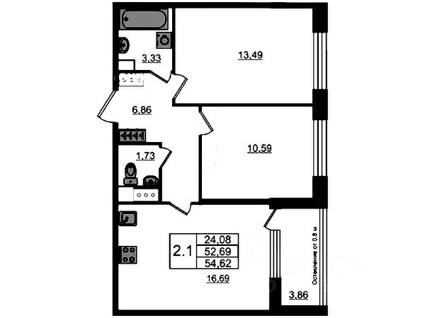 2-комн. кв., 53.2 м², 11/14 этаж