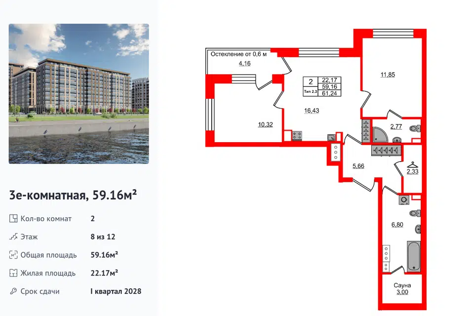 2-комн. кв., 59.16 м², 8/14 этаж