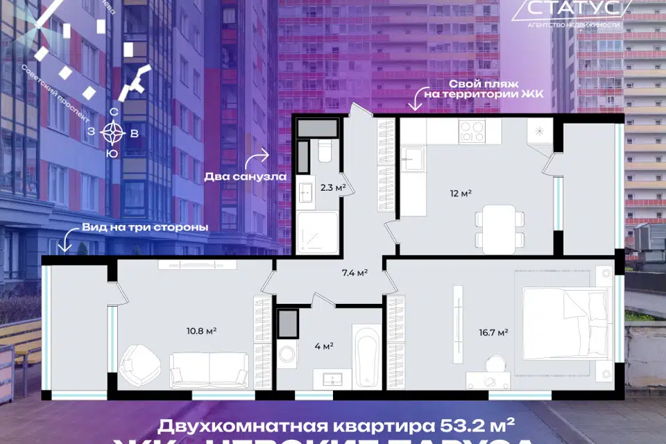 2-комн. кв., 53.2 м², 3/26 этаж