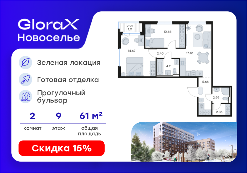 2-комн. кв., 61.08 м², 9/12 этаж
