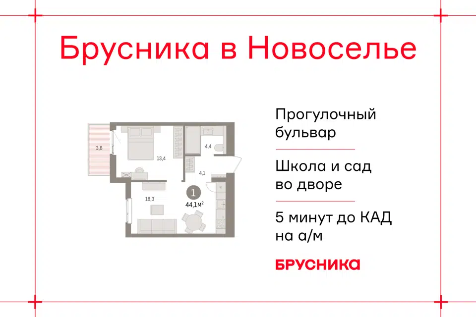 1-комн. кв., 44.06 м², 6/9 этаж