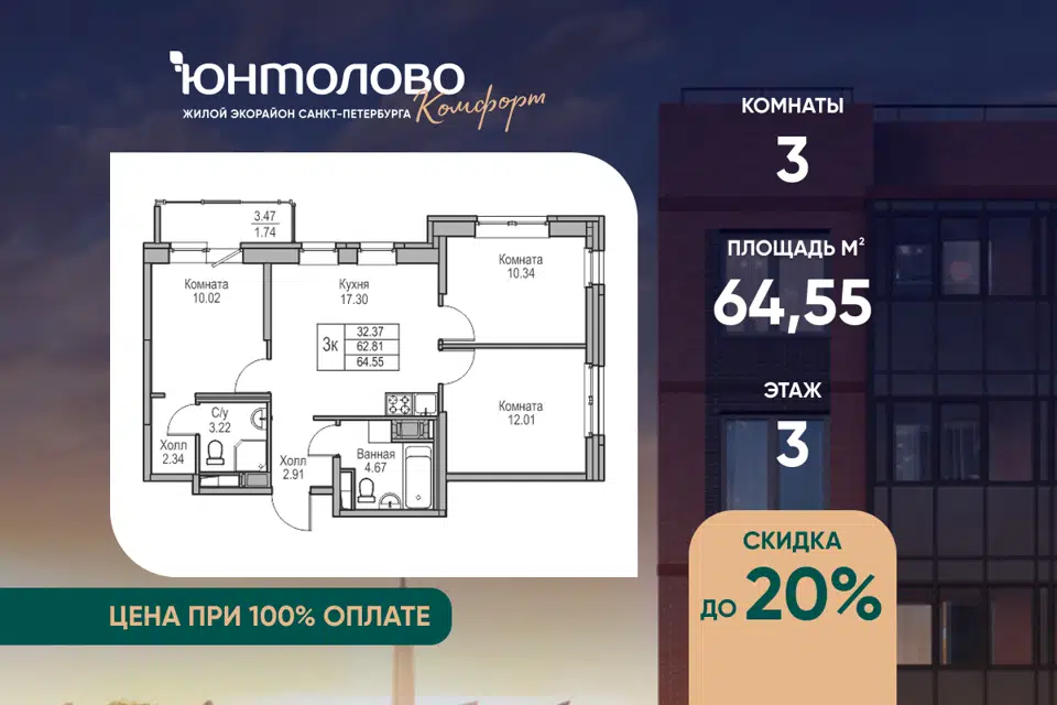 3-комн. кв., 64.55 м², 3/23 этаж
