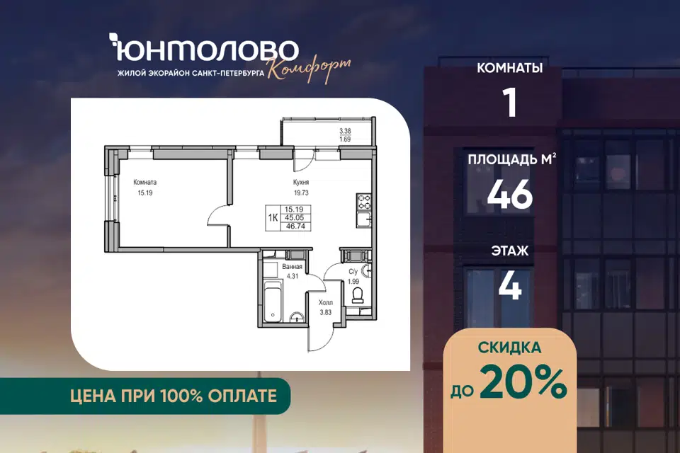1-комн. кв., 46 м², 4/23 этаж