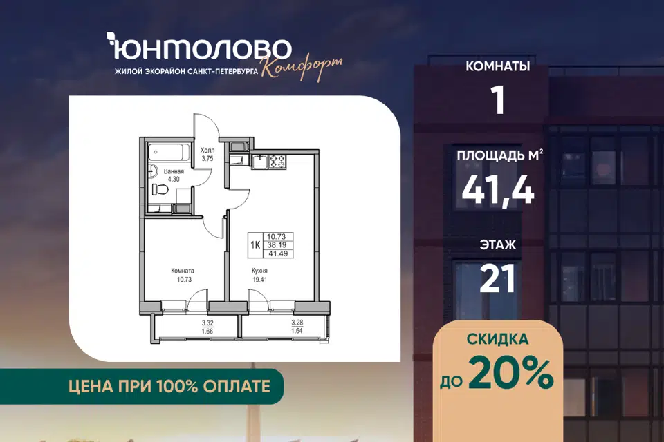1-комн. кв., 41.4 м², 21/23 этаж