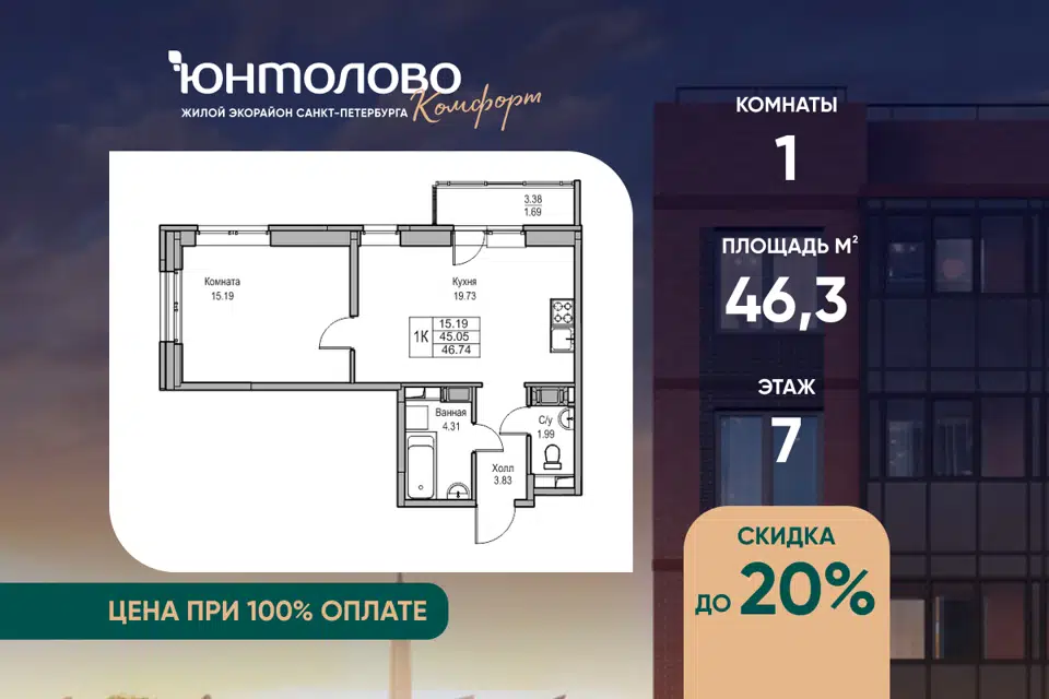1-комн. кв., 46.3 м², 7/23 этаж