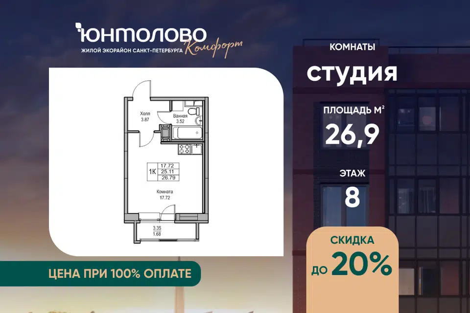 Студия, 26.9 м², 8/23 этаж