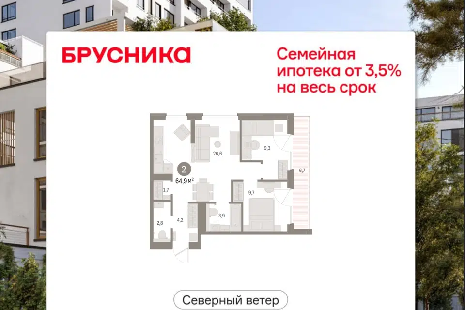 2-комн. кв., 63.9 м², 17/19 этаж