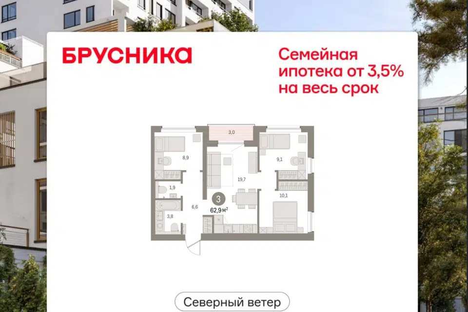 3-комн. кв., 62.09 м², 6/30 этаж