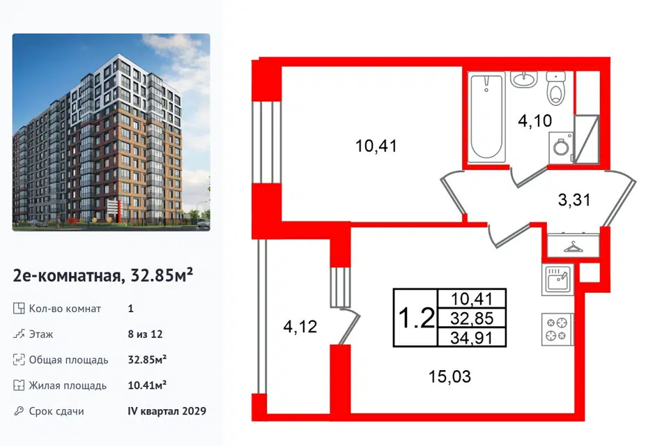 1-комн. кв., 32.85 м², 8/1 этаж