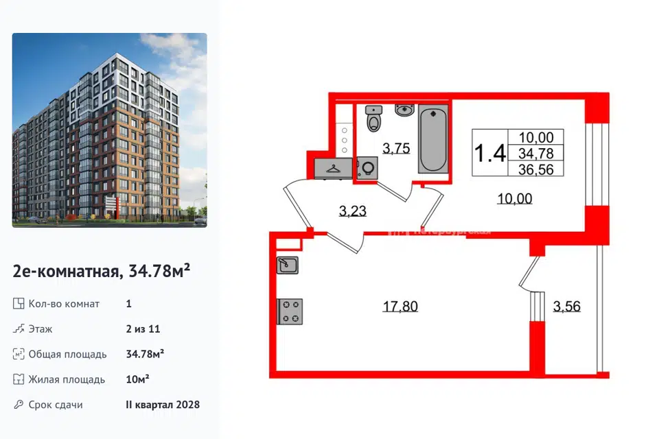 1-комн. кв., 34.78 м², 2/1 этаж