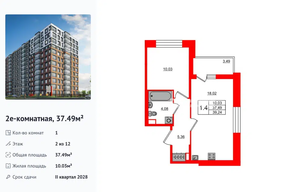 1-комн. кв., 37.49 м², 2/1 этаж