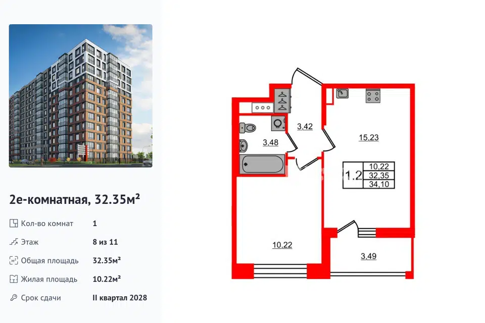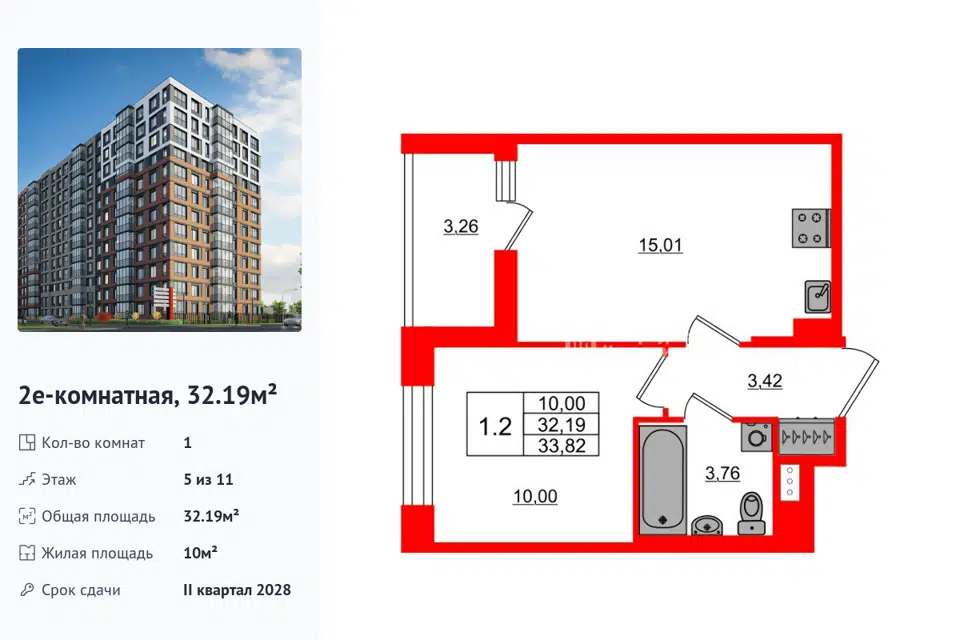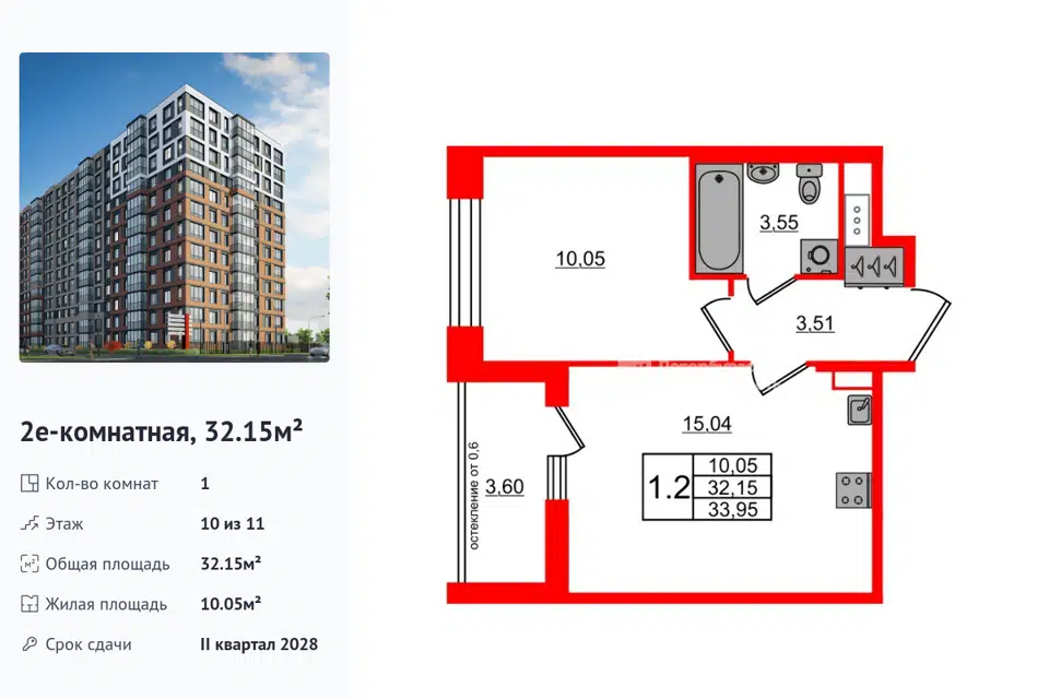 1-комн. кв., 32.15 м², 10/1 этаж