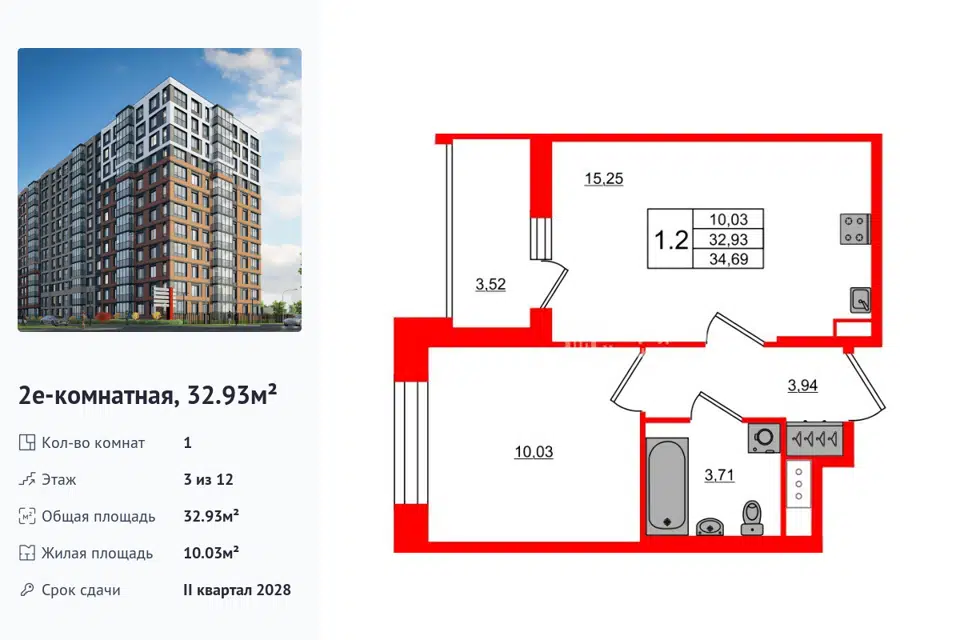 1-комн. кв., 32.93 м², 3/1 этаж