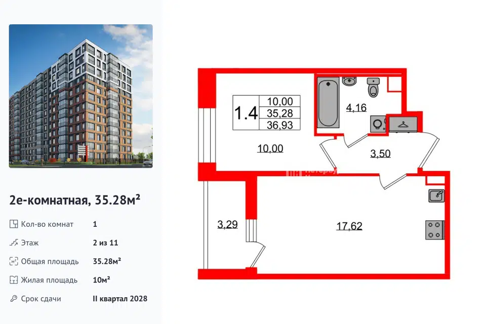 1-комн. кв., 35.28 м², 2/1 этаж