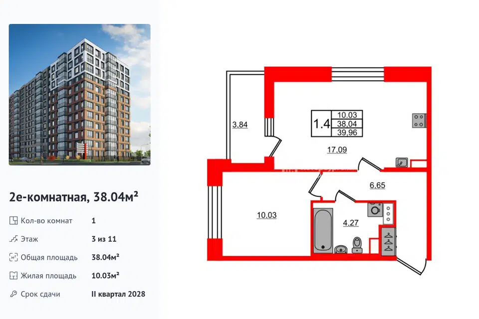 1-комн. кв., 38.04 м², 3/1 этаж