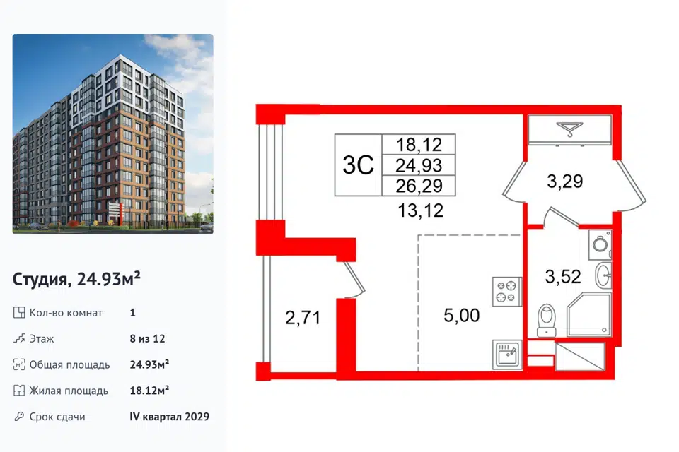 Студия, 24.93 м², 8/1 этаж