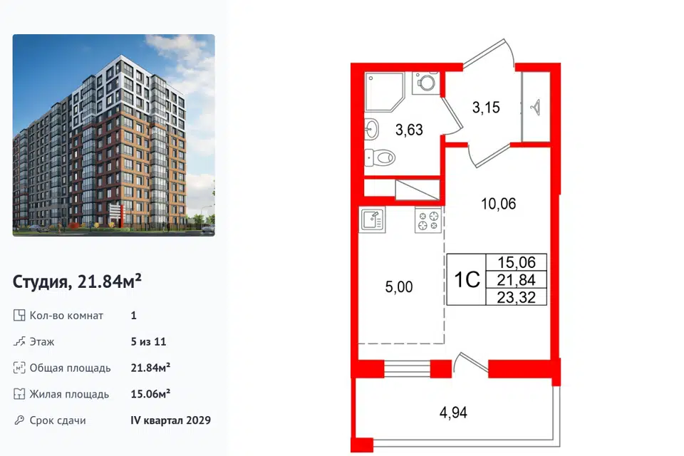 Студия, 21.84 м², 5/1 этаж