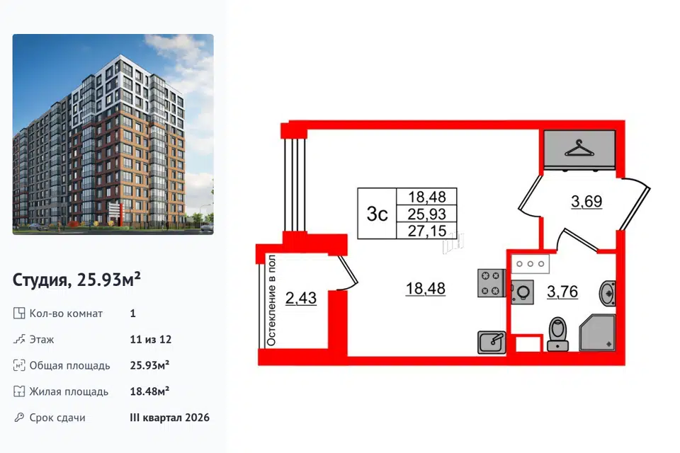 Студия, 25.93 м², 11/1 этаж