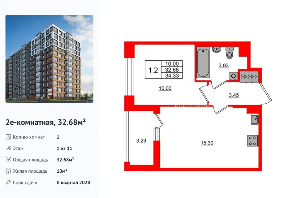 1-комн. кв., 32.68 м², 1/14 этаж