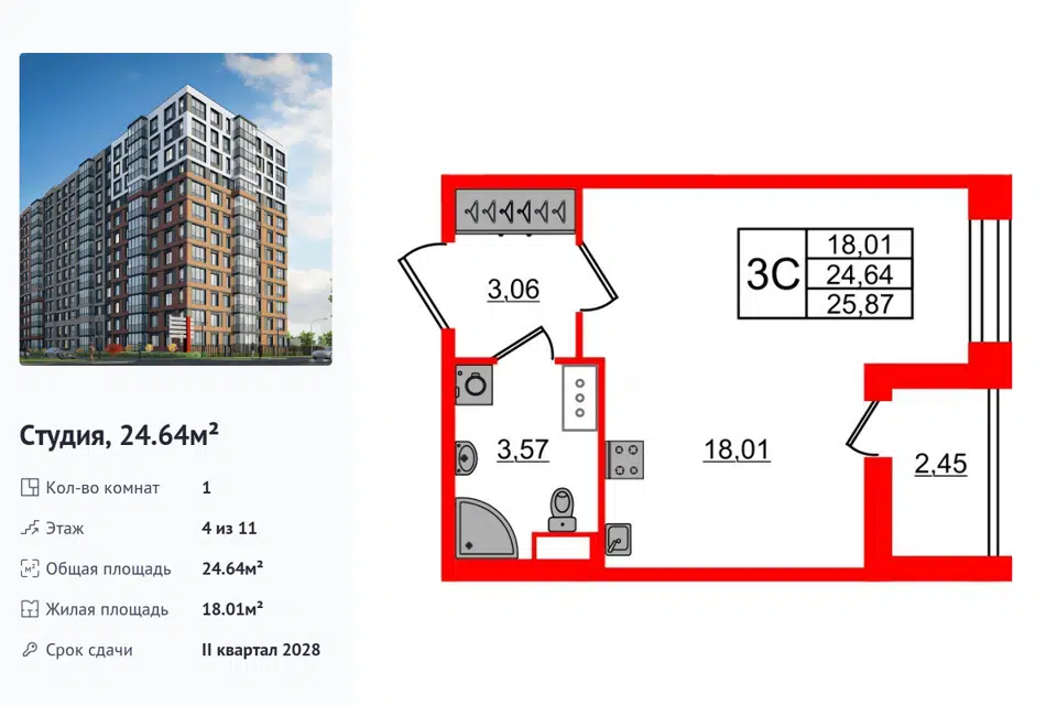 Студия, 24.64 м², 3/14 этаж