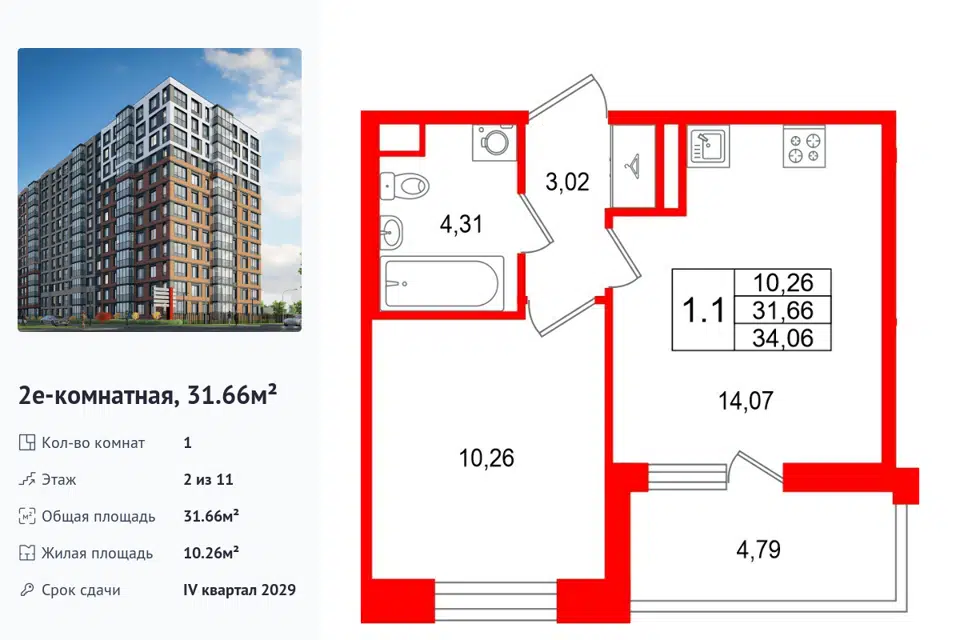 1-комн. кв., 31.66 м², 2/1 этаж
