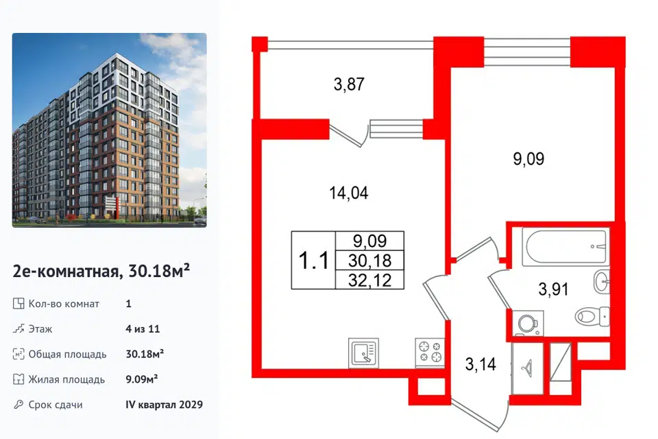 1-комн. кв., 30.18 м², 3/1 этаж