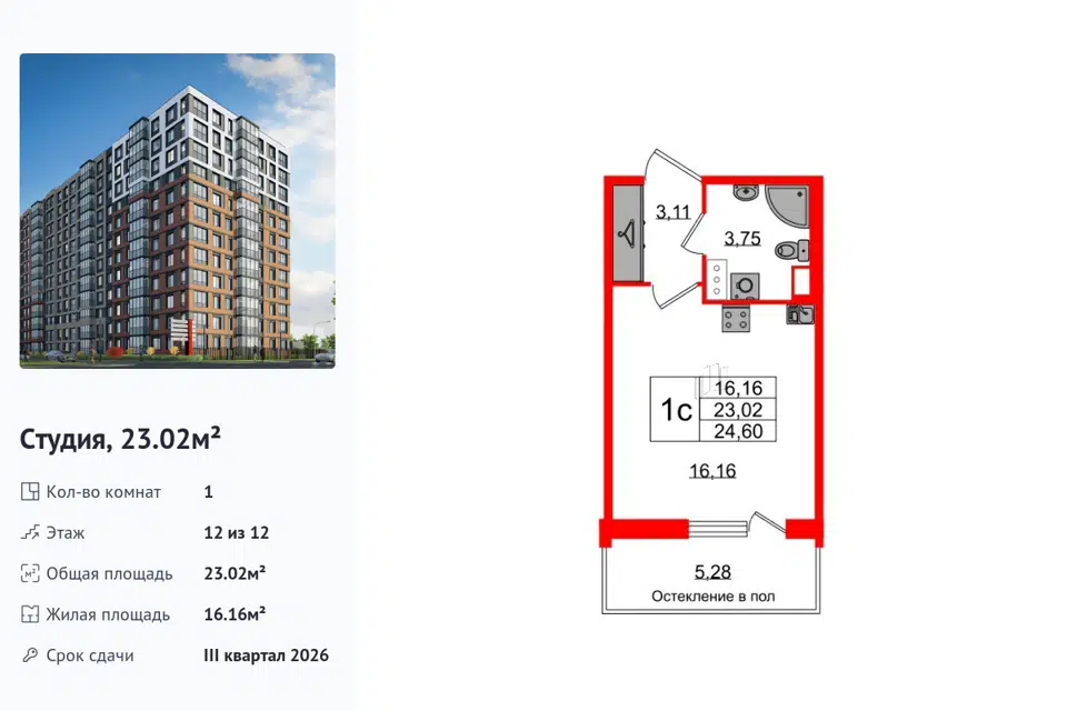 Студия, 23.02 м², 12/1 этаж