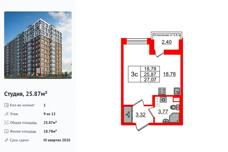 Студия, 25.87 м², 9/1 этаж