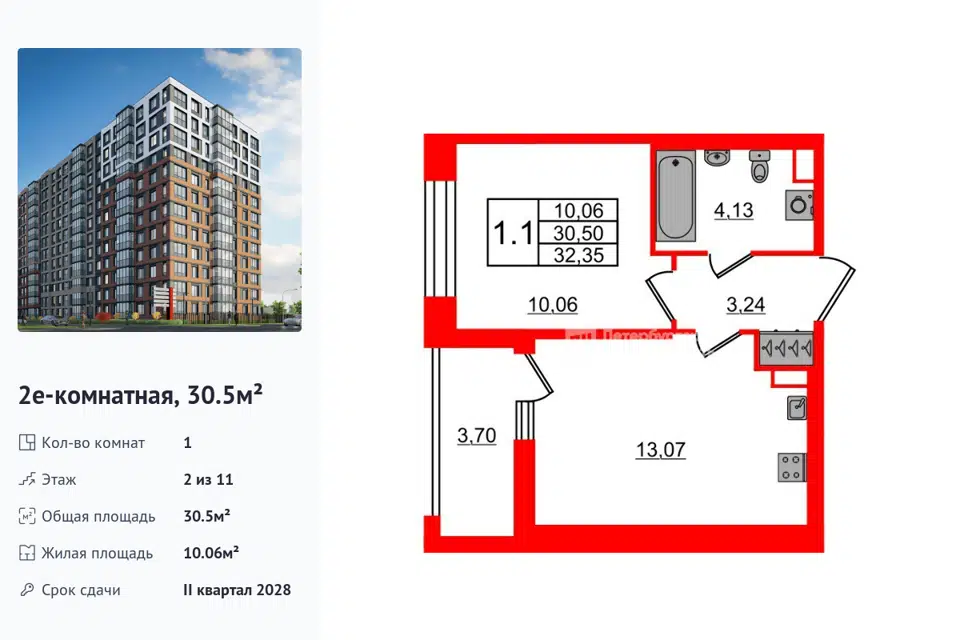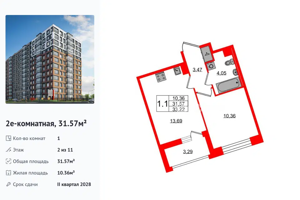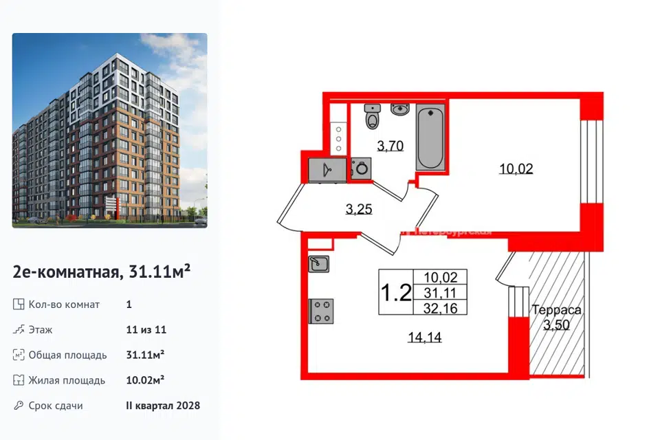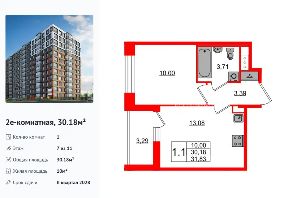 1-комн. кв., 31.11 м², 11/1 этаж