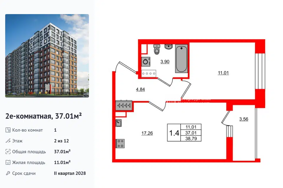 1-комн. кв., 37.01 м², 2/1 этаж