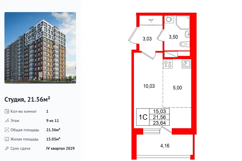 Студия, 21.56 м², 9/1 этаж