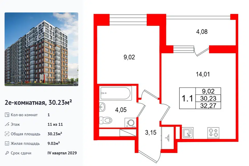 1-комн. кв., 30.23 м², 11/1 этаж
