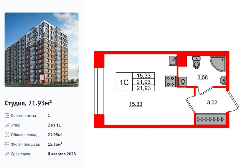 Студия, 21.93 м², 2/14 этаж